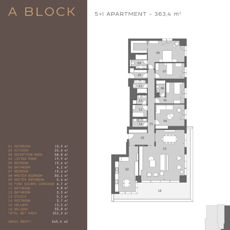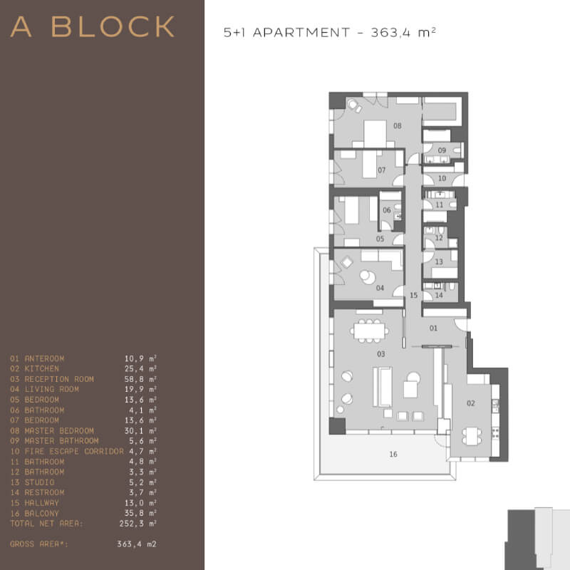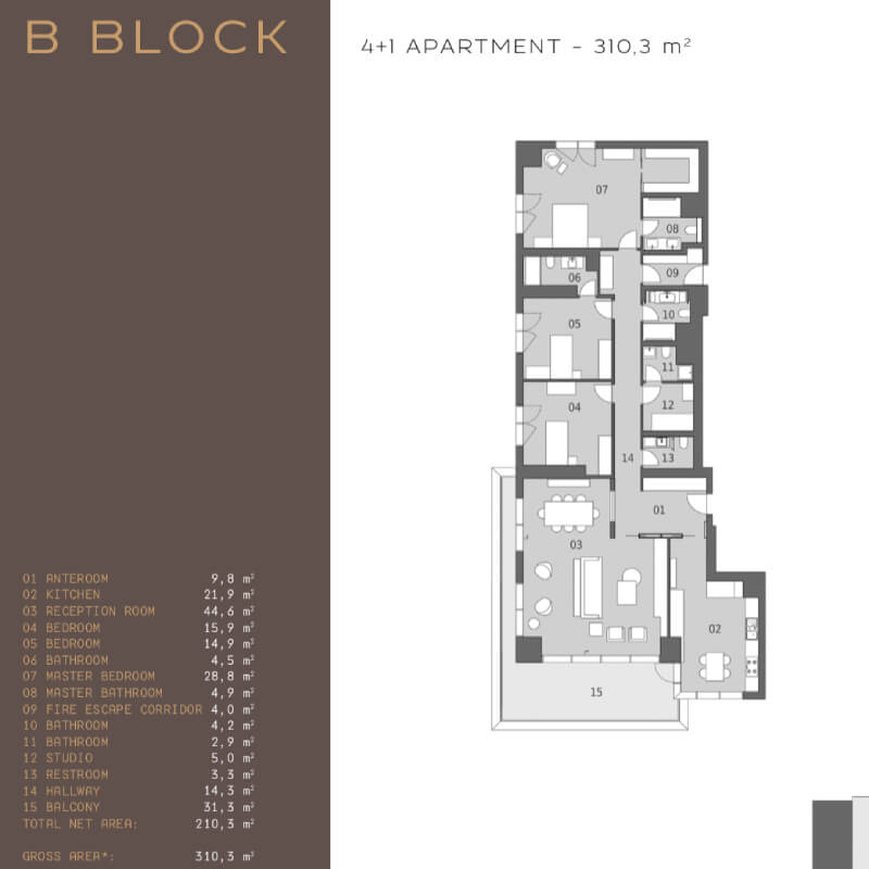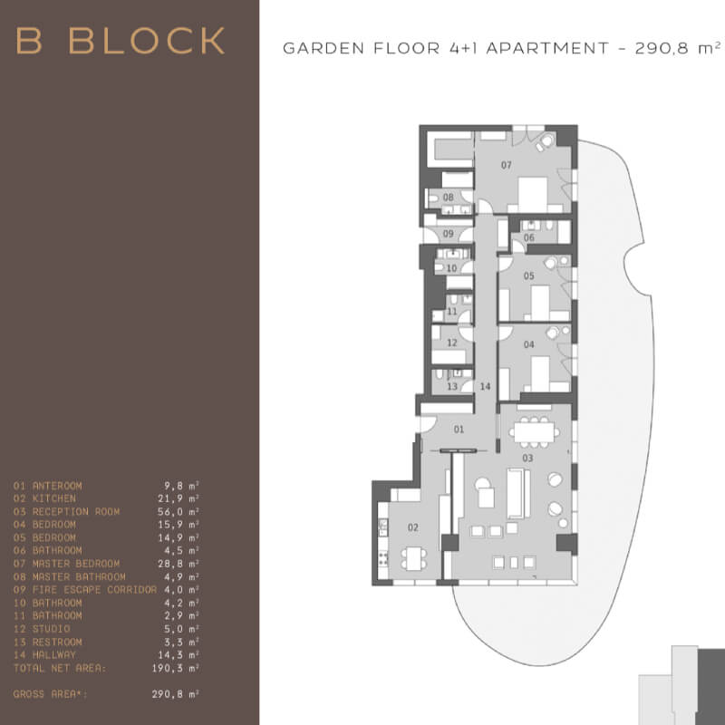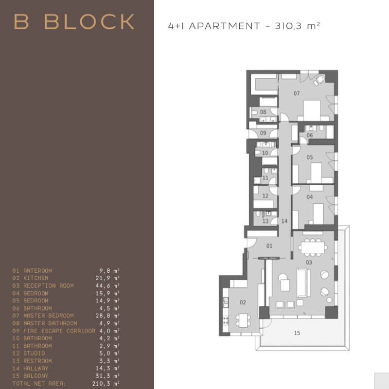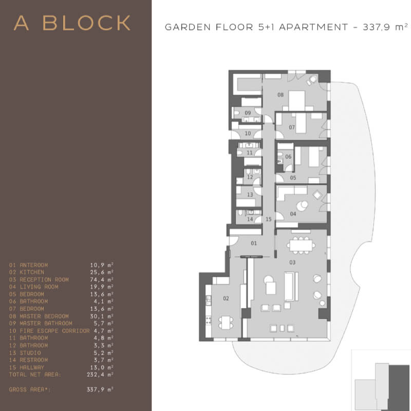 The project was built on an area of 62 thousand 373 square meters, containing 239 apartments in 7 buildings, the buildings were designed as 16 and 17 floors. All apartments in the project are 4 + 1, 4 + 2 duplexes, 5 + 1 and 5 + 2 duplex types. 4-bedroom apartments and a living room with areas starting from 290 square meters, and 5-bedroom apartments and a living room starting from 363 square meters, there are 1 + 1 and 2 + 1 home offices in the separate block of the project.