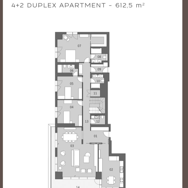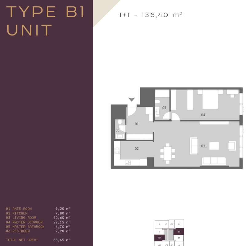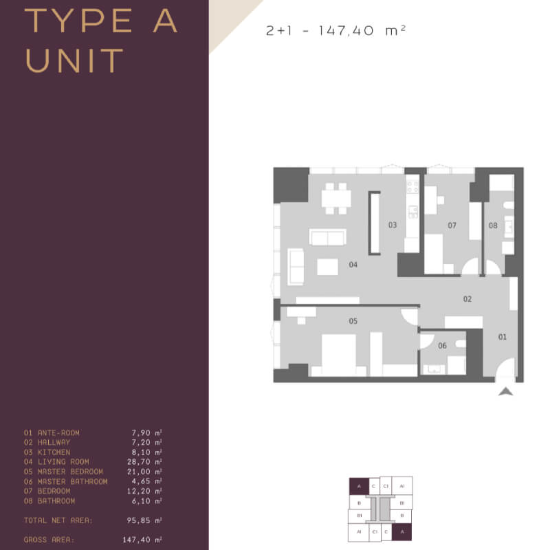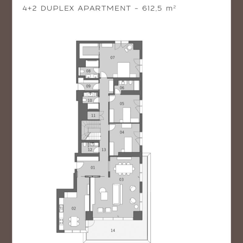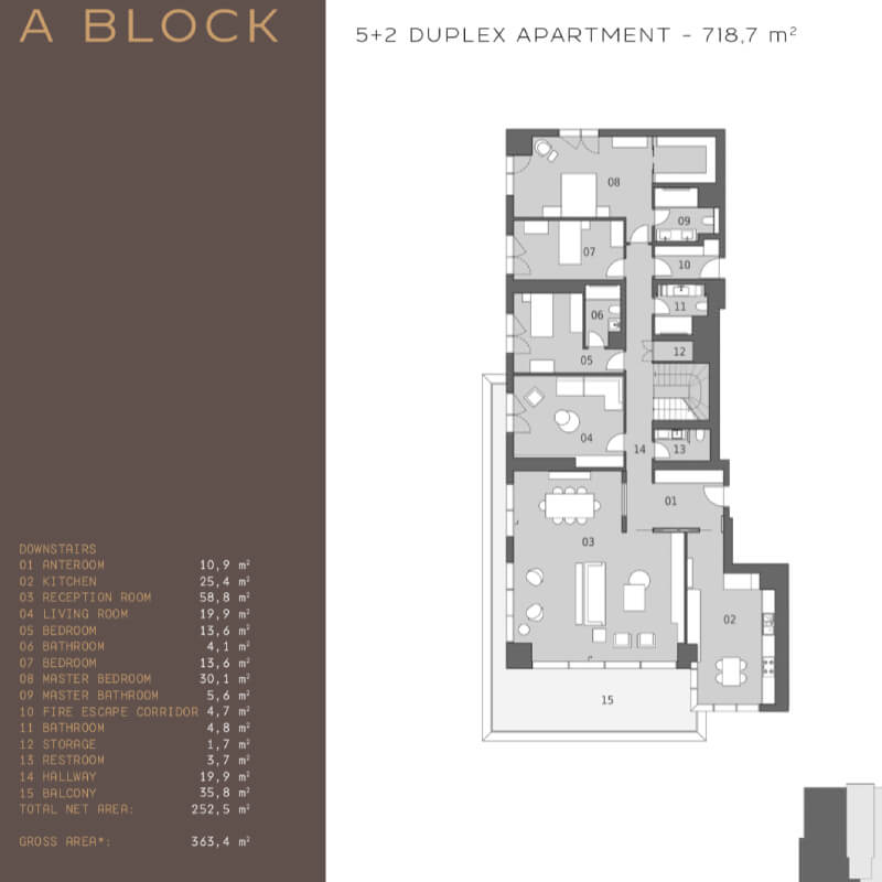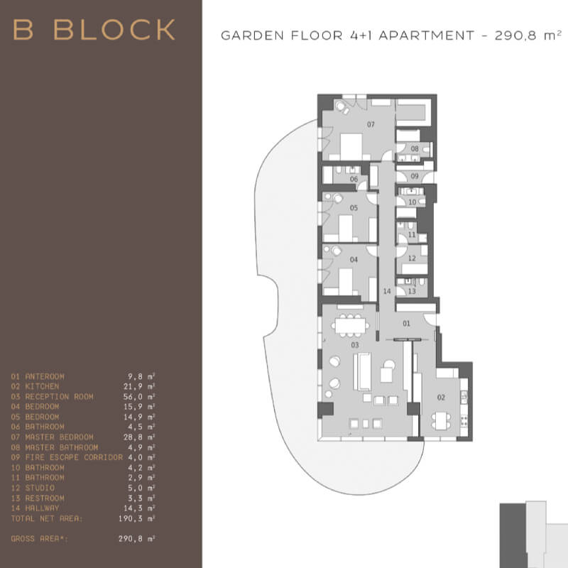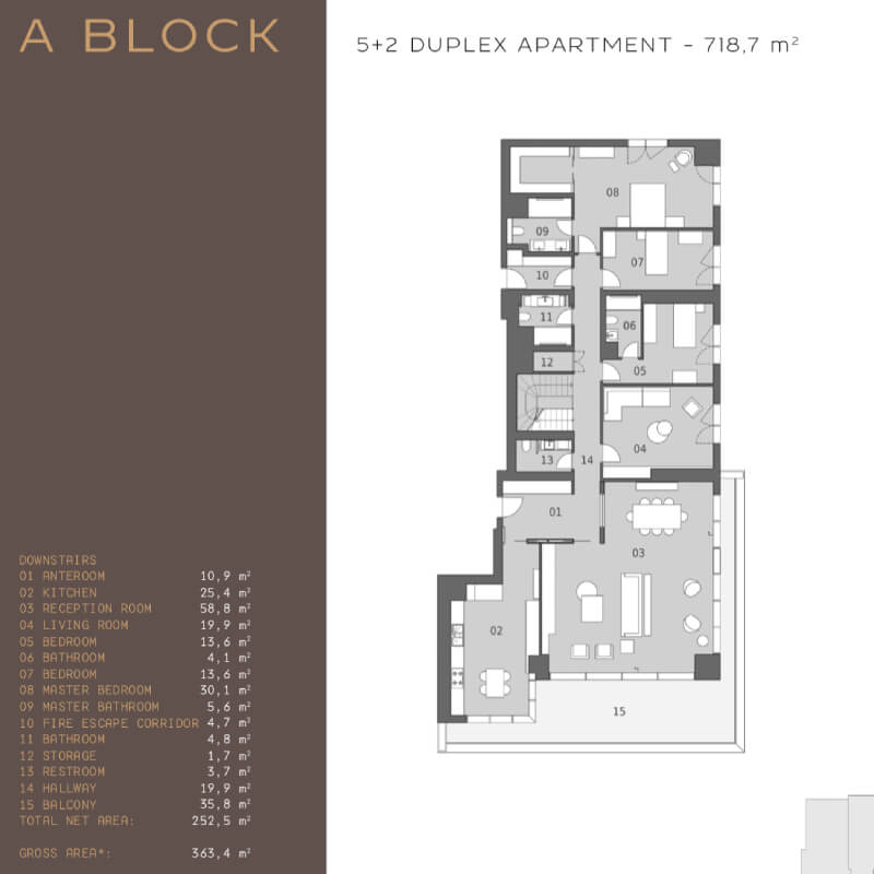 The project was built on an area of 62 thousand 373 square meters, containing 239 apartments in 7 buildings, the buildings were designed as 16 and 17 floors. All apartments in the project are 4 + 1, 4 + 2 duplexes, 5 + 1 and 5 + 2 duplex types. 4-bedroom apartments and a living room with areas starting from 290 square meters, and 5-bedroom apartments and a living room starting from 363 square meters, there are 1 + 1 and 2 + 1 home offices in the separate block of the project.