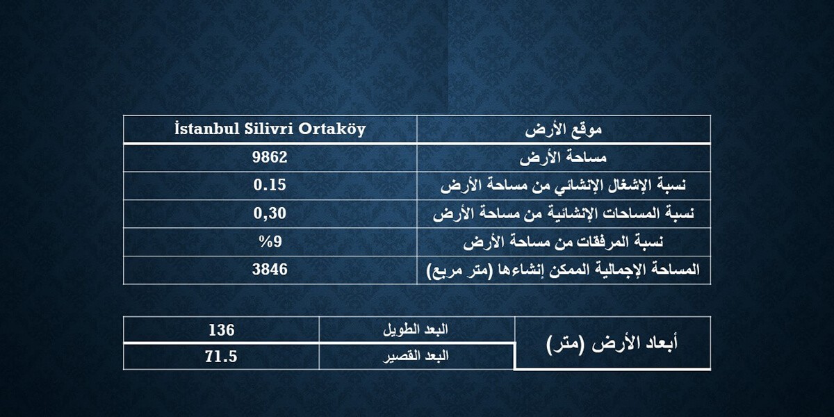Project features: Land for sale in Istanbul Silvery with a stunning natural view, with an area of 9862 square meters The total area that can be constructed is 3846 square meters, in addition to the net area ratio of the villa to the land area 9%.