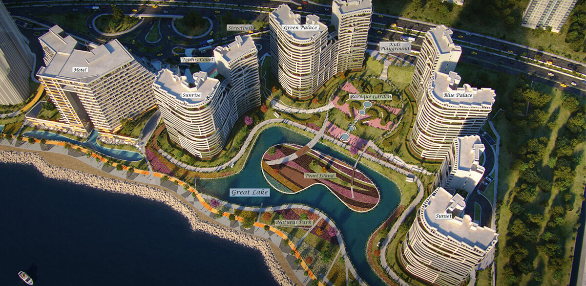 Project details: Apartments for sale in Istanbul - Atakoy The Sea Pearl Atakoy project is located on the European side of Istanbul, and you can reach it from Ataturk International Airport within 10 minutes by car. It is a mixed-use real estate project that includes residential units overlooking the waterfront, characterized by a high-end lifestyle with exceptional quality in details and brands as well as a unique location. The project consists of 8 residential towers comprising 1480 housing units, and a 5-star hotel that includes 120 private hotel units, 95 hotel apartments, and shops. All units of the project, including hotel rooms, have a wonderful view of the sea. The project will have a direct road to the Atakoy coast, and more than 100,000 square meters have been allocated for green spaces that will consist of plant formations, unique landscapes and baroque-style gardens covered with pine trees. Thanks to its distinctive design, the Sea Pearl Atakoy project has become the only project in Istanbul that overlooks the sea coast with an interconnected facade that every unit of the project can enjoy, and residents can benefit from the sea marina, the international airport, shopping centers and a world-class luxury hotel.