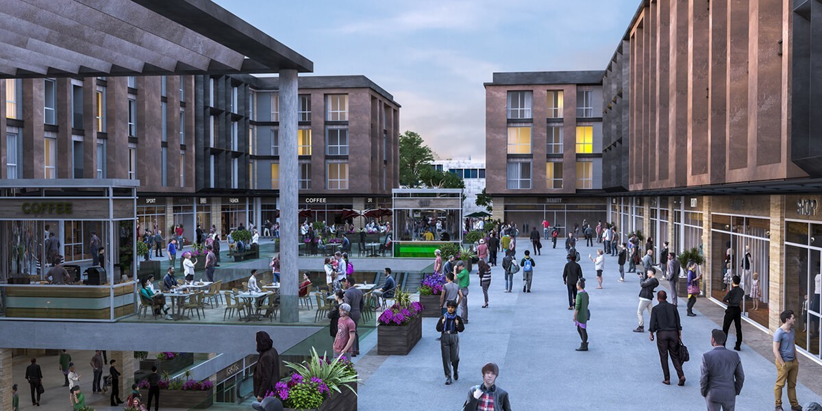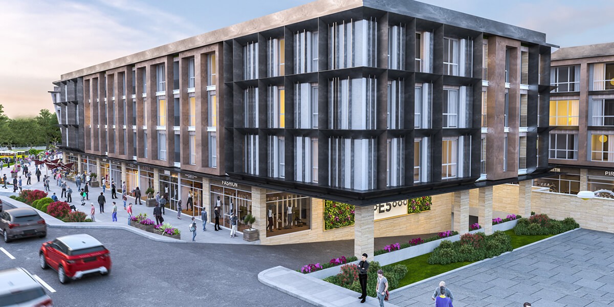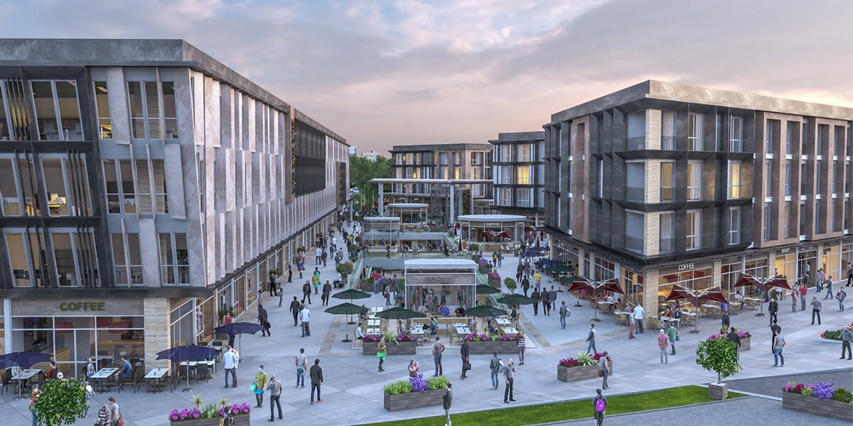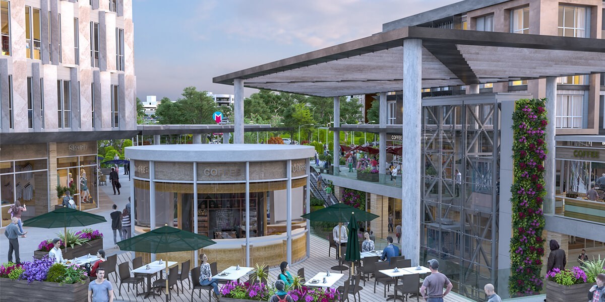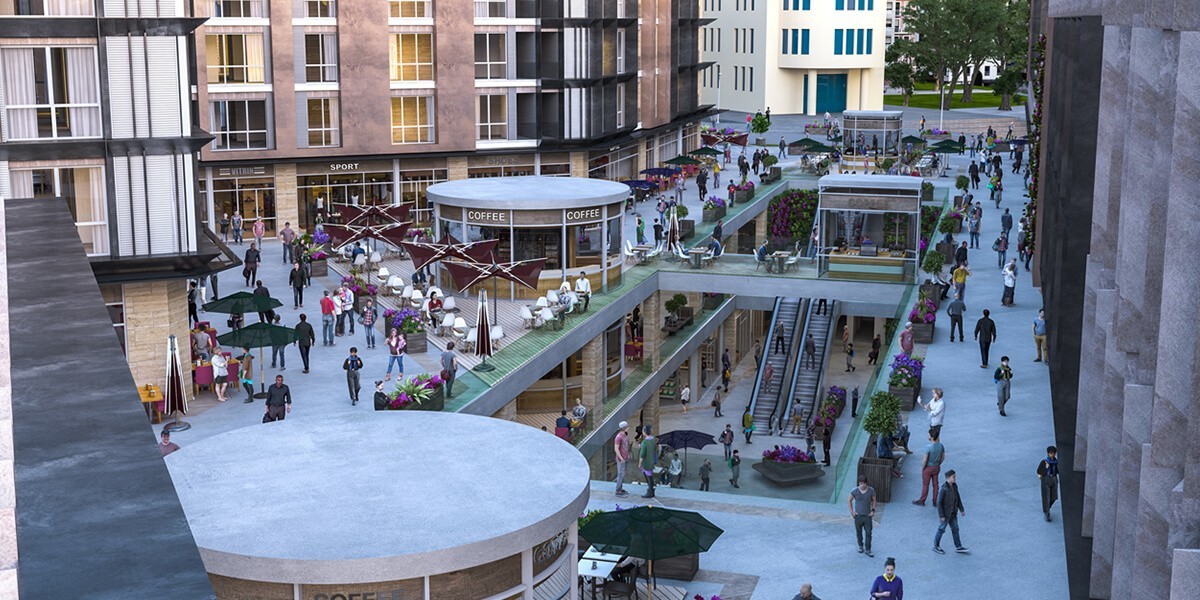 The living spaces consist of housing, offices, restaurants, cafes, shops, and transportation facilities such as metro and metrobus